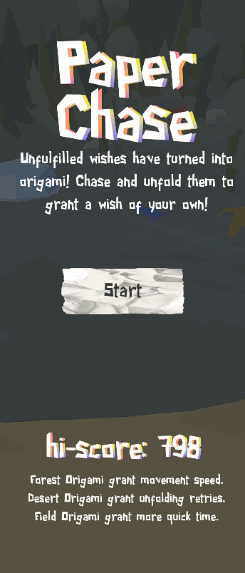 Each Origami asset was sourced from Runemark Studios on the Unity Asset Store. I visually scripted the origami’s rocking idle animation and randomized jumps and various run speeds to make each origami unique and lively. Additionally, each origami caught grants the players bonus stats, such as increased unfolding time, extra attempts to unfold, and greater movement speed.
